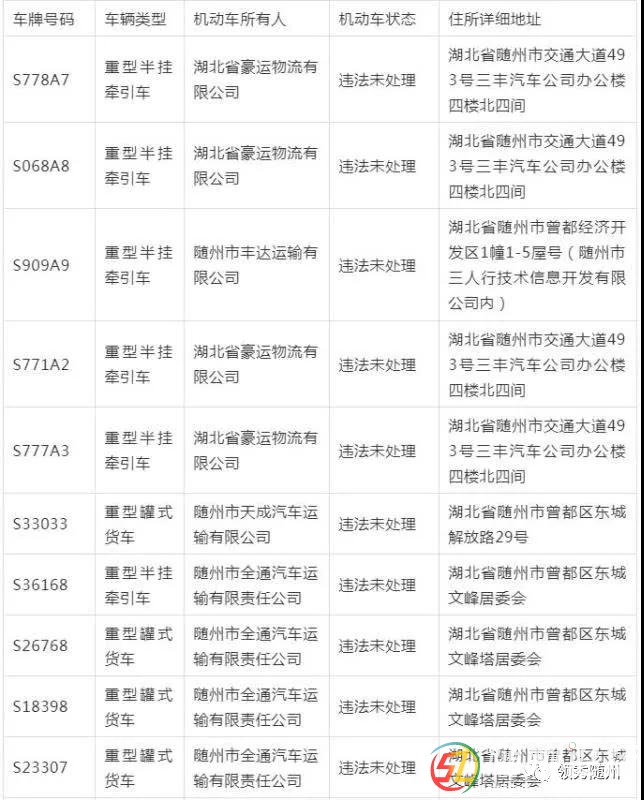 根據(jù)《關(guān)于2018年11月各地重點(diǎn)車(chē)輛交通違法定期“清零”工作情況的通報(bào)》,隨州籍鄂S?;愤\(yùn)輸車(chē)(重型半掛牽引車(chē))違法未清零共17臺(tái)。 危化品運(yùn)輸車(chē)違法未處理明細(xì)(共17臺(tái))隨 ...