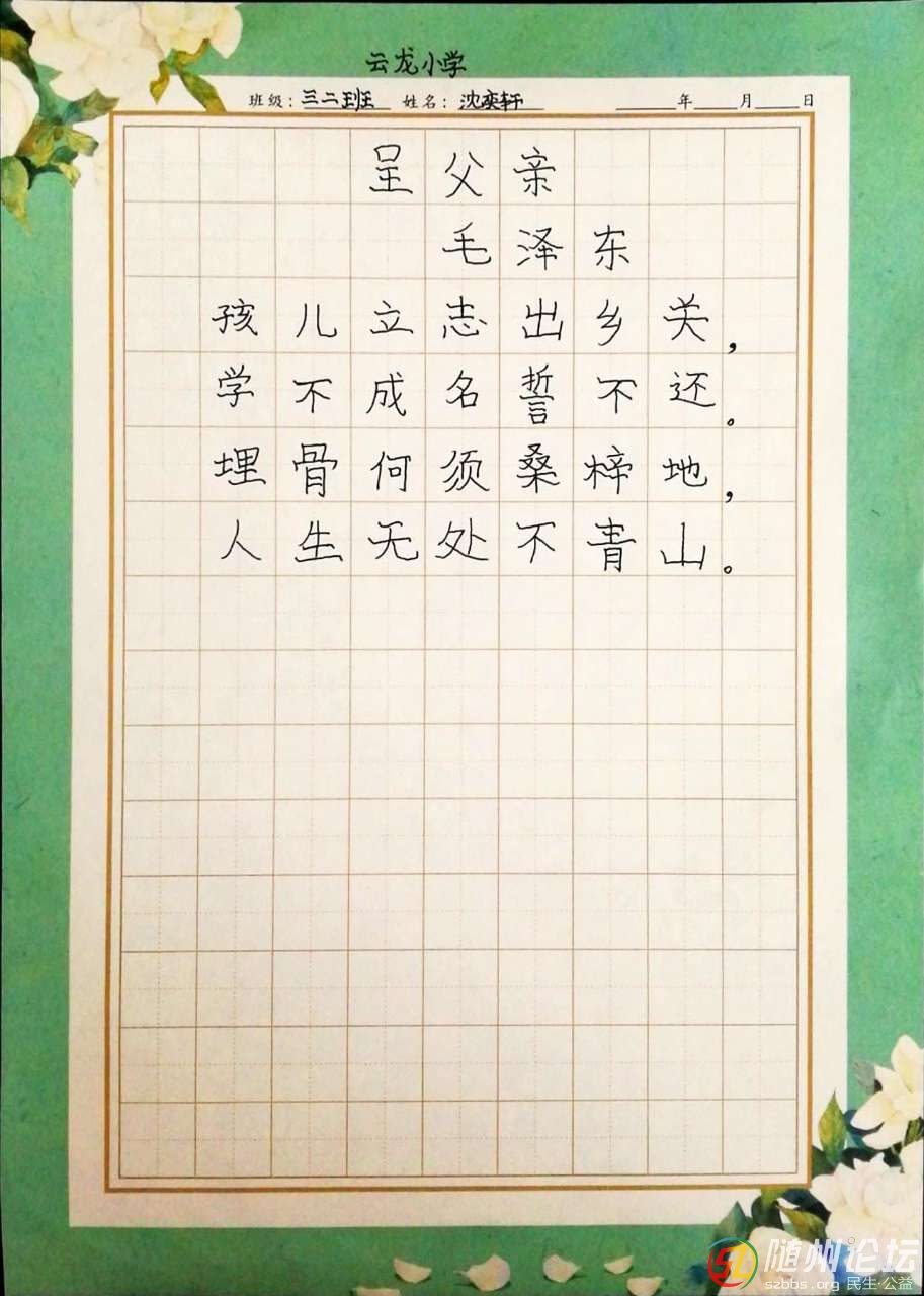 本帖最后由 保質(zhì)期 于 2019-3-12 10:24 編輯 高新區(qū)云龍小學(xué)三(2)班沈奕軒書(shū)法作品
