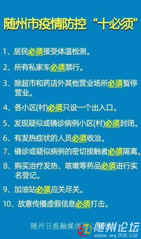 本帖最后由 知足而樂 于 2020-2-4 21:55 編輯 隨州市疫情防控“十必須” 1.居民必須接受體溫檢測。2.所有私家車必須禁行。3.除超市和藥店外其他營業(yè)場所必須暫停營業(yè)。4.各小區(qū)(村)必須只設(shè)一個出入口。5.發(fā) ...