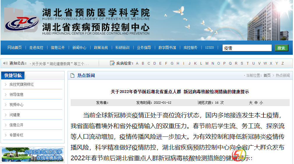 本帖最后由 隨州日報 于 2022-1-12 16:16 編輯 來源:湖北發(fā)布、湖北省疾病預防控制中心 關于2022年春節(jié)前后湖北省重點人群新冠病毒核酸檢測措施的健康提示 當前全球新冠肺炎疫情正處于高位流行狀態(tài),國內(nèi)多地 ...