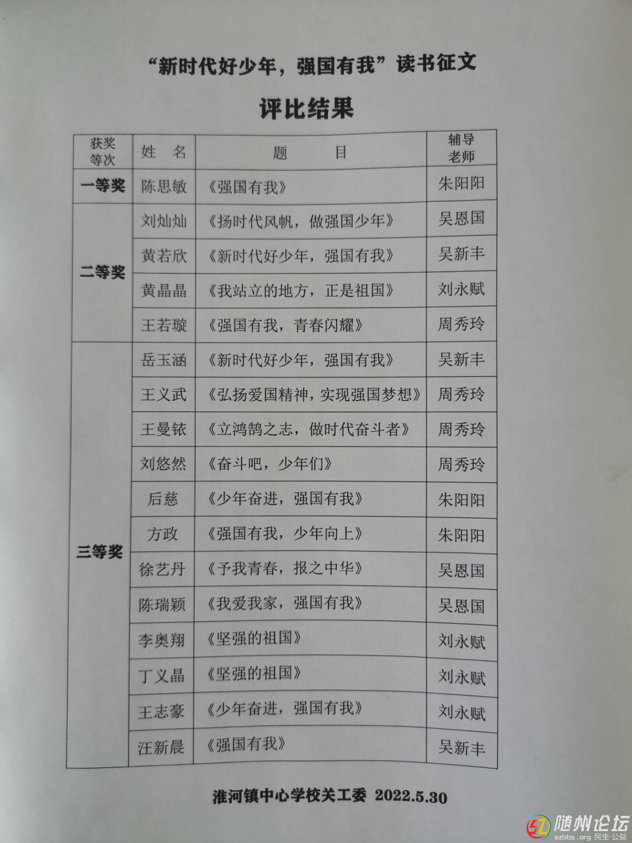 隨州論壇訊 (通訊員 劉永賦)“一等獎(jiǎng):陳思敏 二等獎(jiǎng):黃晶晶 劉燦燦 黃若欣 王若旋……”5月30日,淮河鎮(zhèn)中心學(xué)?!皬?qiáng)國有我”讀書征文比賽成績揭曉,在學(xué)校公示欄展出后,引發(fā)強(qiáng)烈反響。 ...
