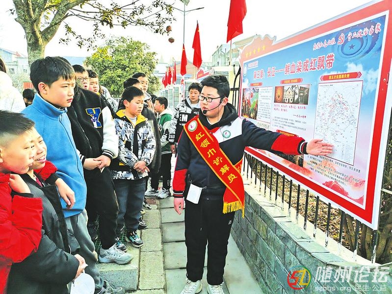 春季開(kāi)學(xué)以來(lái),曾都區(qū)洛陽(yáng)鎮(zhèn)中心學(xué)校大力組織學(xué)生進(jìn)行紅色文化知識(shí)學(xué)習(xí)。圖為紅領(lǐng)巾解說(shuō)員在為同學(xué)們解說(shuō)展板上的紅色故事。(隨州日?qǐng)?bào)通訊員趙正勇攝) ...