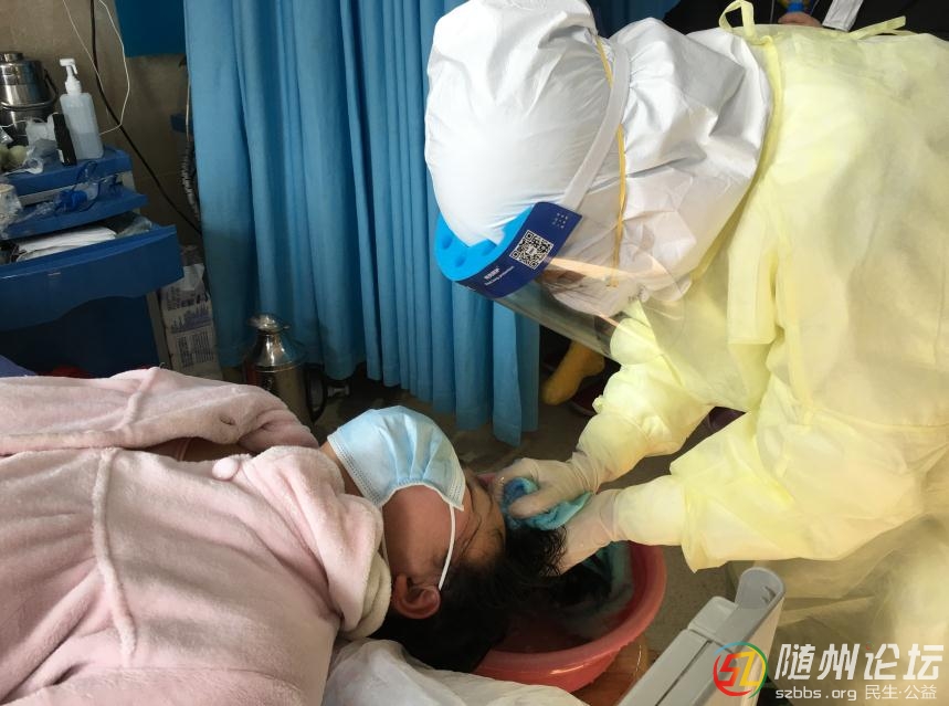 2月9日,隨州市中心醫(yī)院感染性疾病科一病區(qū)內,該科支援護士龔雪瑤為新冠肺炎確診患者洗頭的一幕令人動容。% @* M3 t+ r7 j' `& G* o+ d) ?5 k